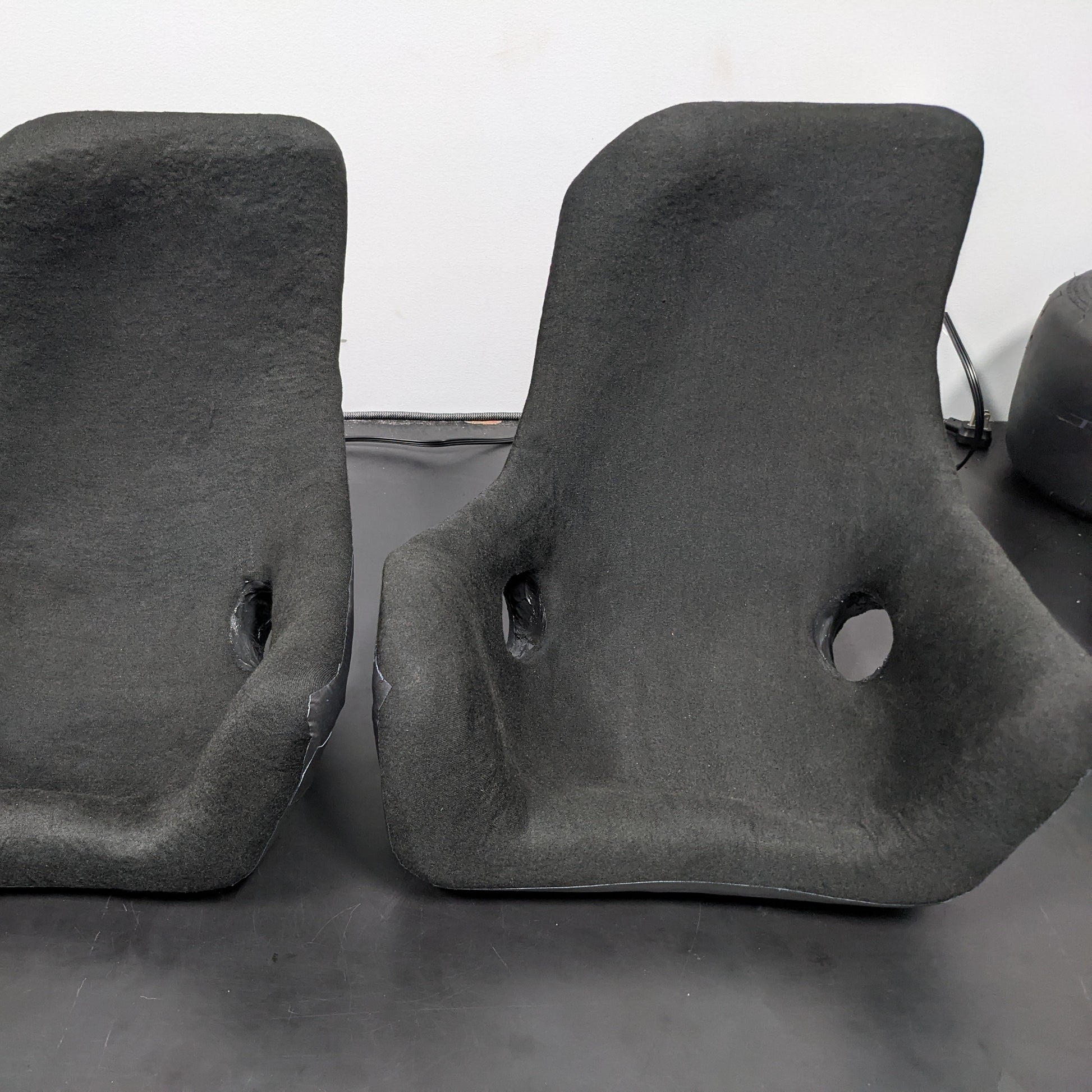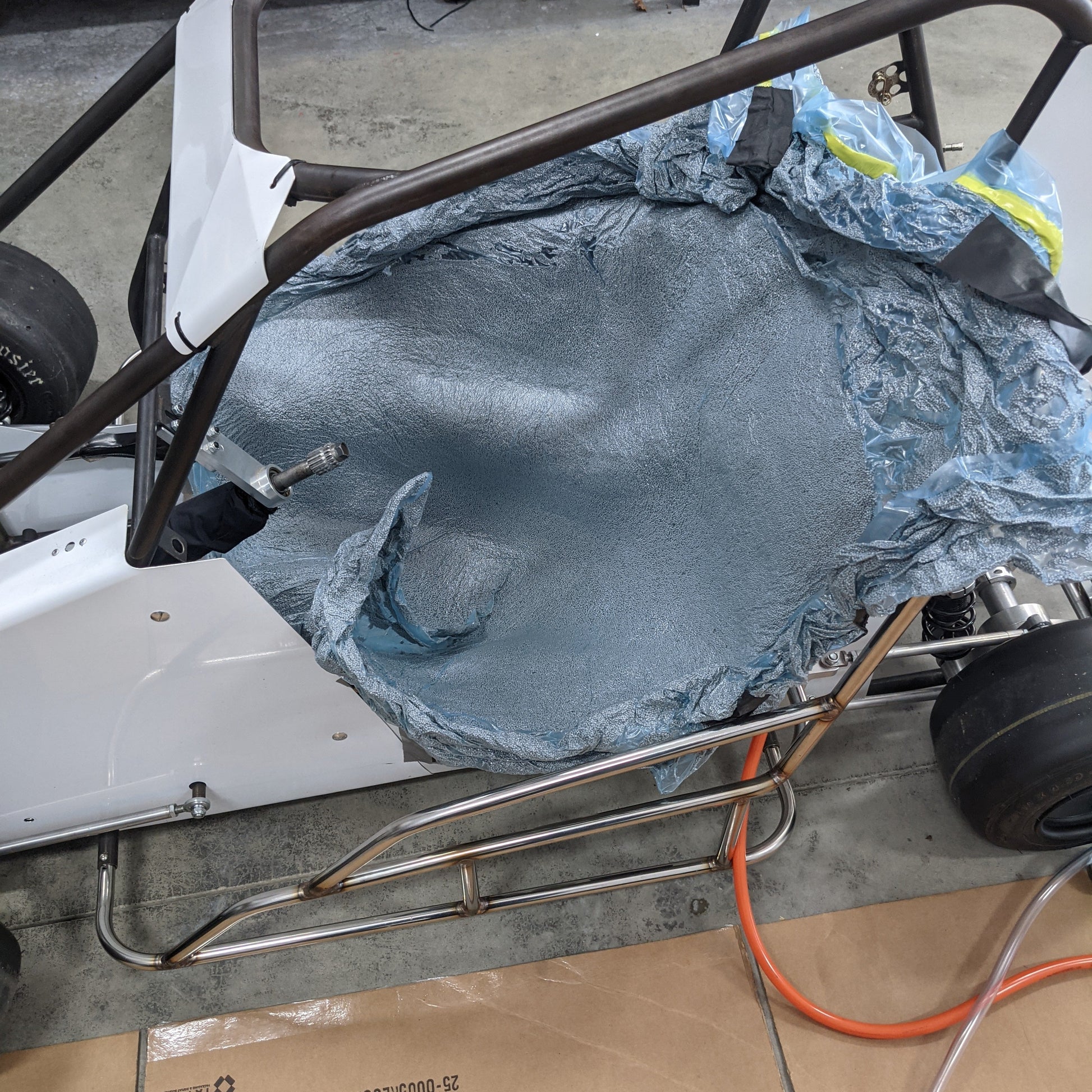 This kit includes the foam bag, resin and hardener, gaffers tape, black Nomex covering, vacuum tube, and mixing bucket. Items that will need to be purchased separately is a small vacuum pump, a hot knife, 3M Super77 spray adhesive, and black indoor/outdoor caulk. The caulk would be used in the seat belt holes, once the Nomex has been placed.